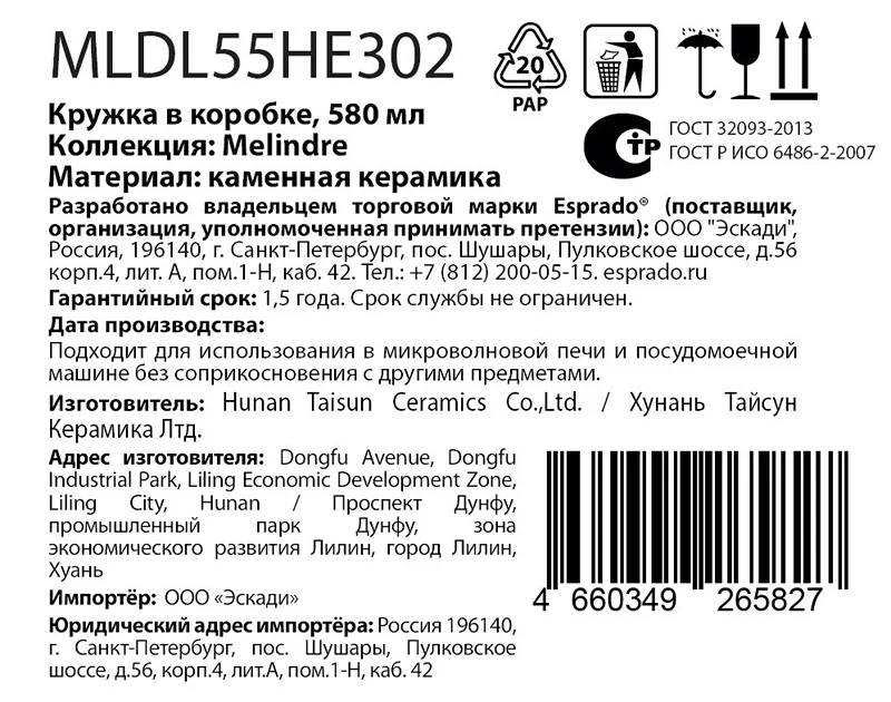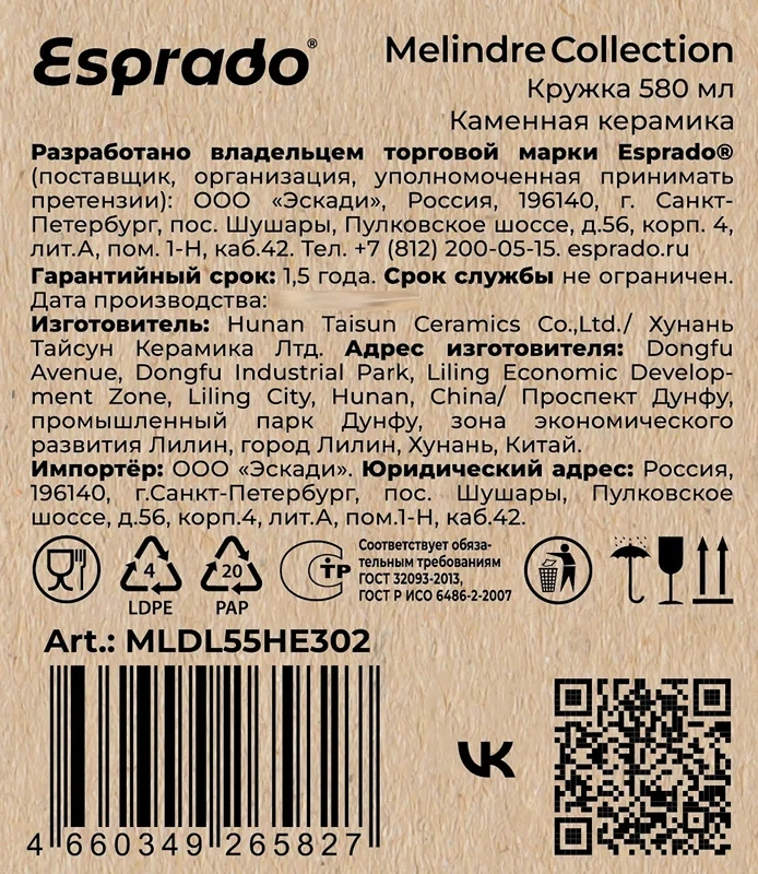 Кружка Esprado Melindre в подарочной упаковке, 580мл
