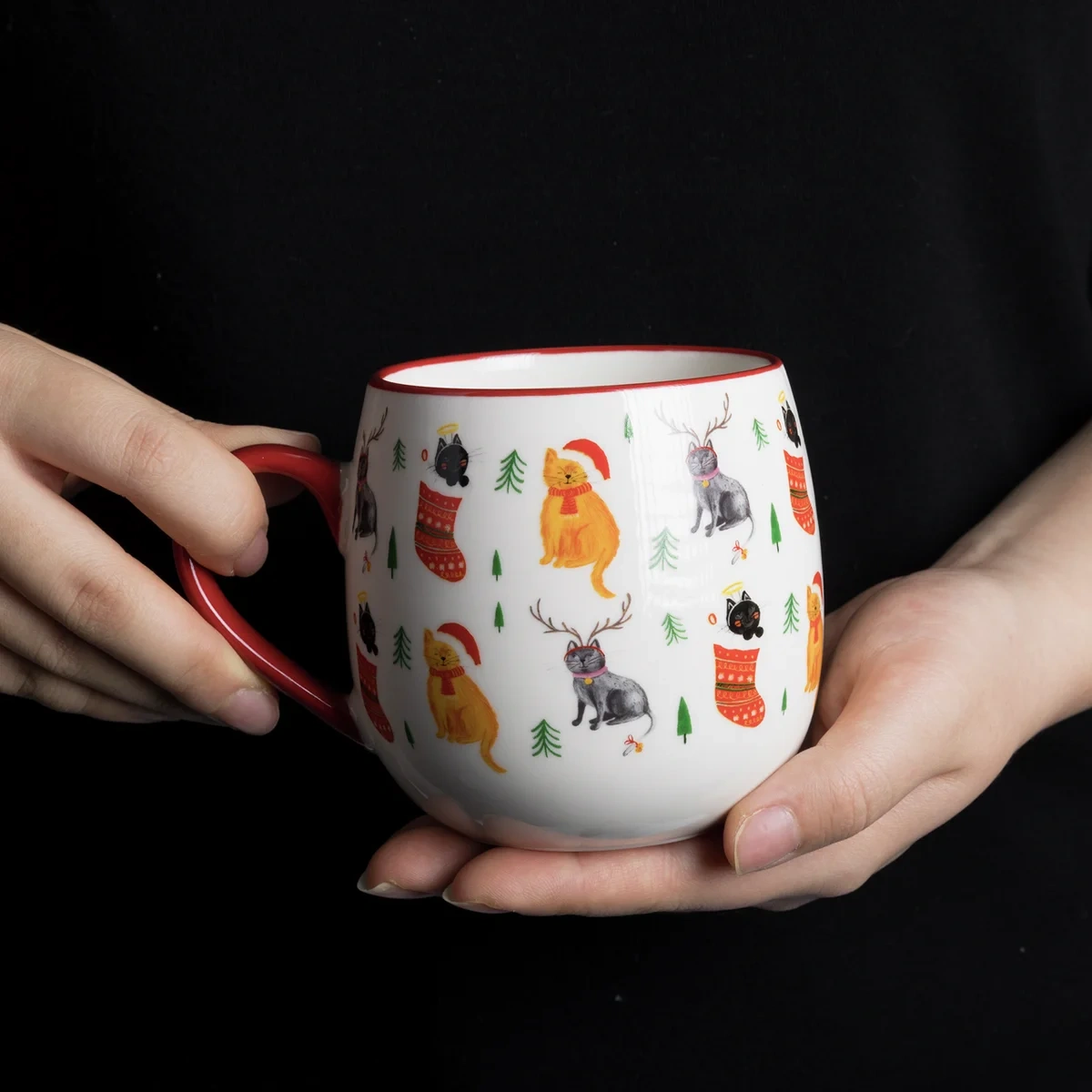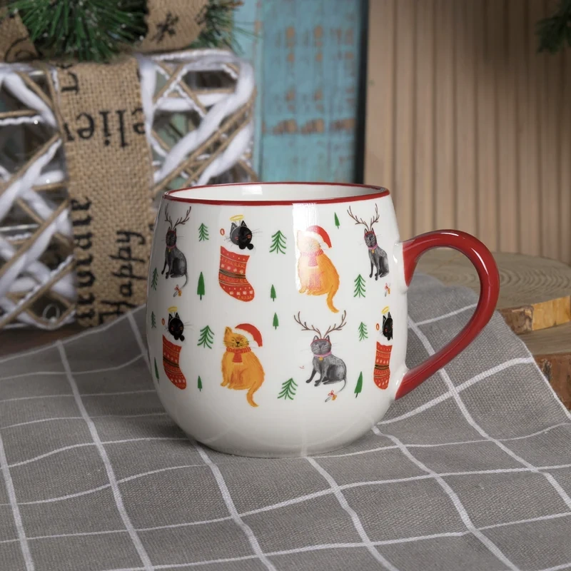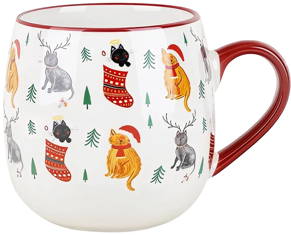 Кружка коллекции Pulover создаст вам праздничное настроение! Кружка изготовлена из фарфора, а ее шарообразная форма напоминает елочный шар. Главное в кружке Pulover - милые кошки, которые носят новогодние и рождественские символы. Отводка и ручка кружки окрашены в красный цвет. Деколь сохранит свой цвет и не сотрется со временем благодаря глазури. Кружки Pulover можно греть в микроволновой печи и посудомоечной машине.