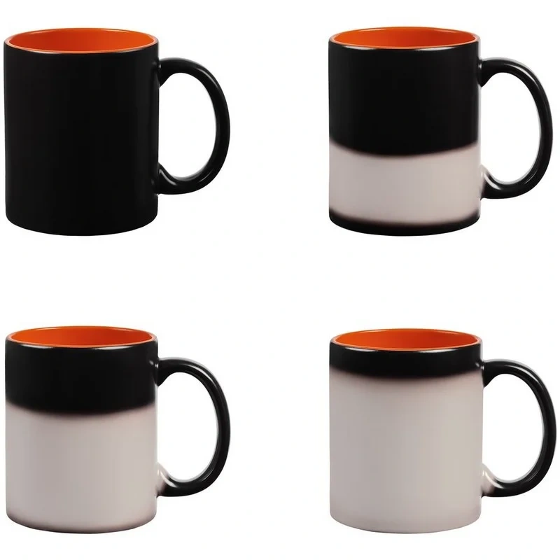 Кружка-хамелеон обладает интересным эффектом: стоит налить горячую воду, и ее цвет поменяется с черного на белый.Емкость 330 мл. Материал: фаянс Размер: высота 9,5 см, диаметр 8,1 см Цвет: оранжевый, черный