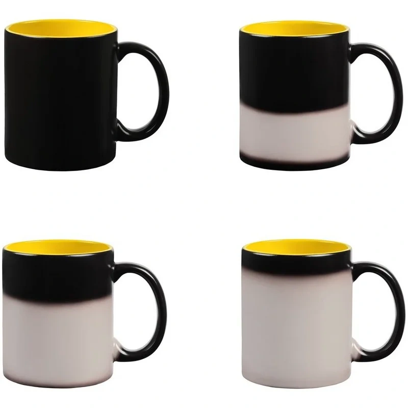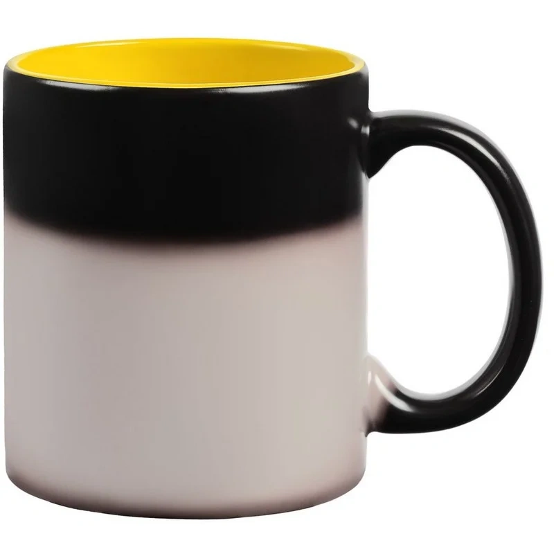 Кружка-хамелеон обладает интересным эффектом: стоит налить горячую воду, и ее цвет поменяется с черного на белый.Емкость 330 мл. Материал: фаянс Размер: высота 9,5 см, диаметр 8,1 см Цвет: желтый, черный