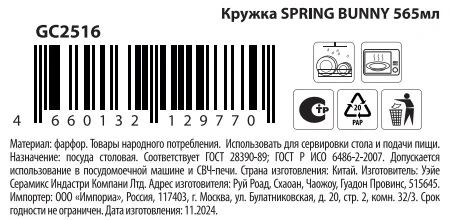 Кружка Spring Bunny - это яркое весеннее настроение и практичность в одном аксессуаре. Благодаря объёму 565мл, она идеально подойдёт для больших порций чая, кофе, какао или других любимых напитков, создавая атмосферу уюта и комфорта.