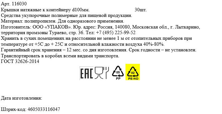 Крышка выполнена из полипропилена, можно подвергать нагреву, в том числе и в микроволновых печах. Упаковка подходит для хранения готовой еды в режиме подогрева от 4 до 12 часов, в зависимости от блюда и для разогрева в микроволновой печи при температуре до 100С).Крышка для контейнеров, которые используют для упаковки полуфабрикатов, мороженого и готовых изделий, удобны для транспортировки и хранения широкого ассортимента продукции.