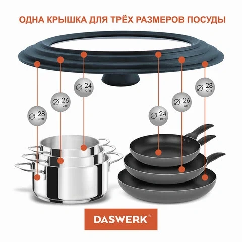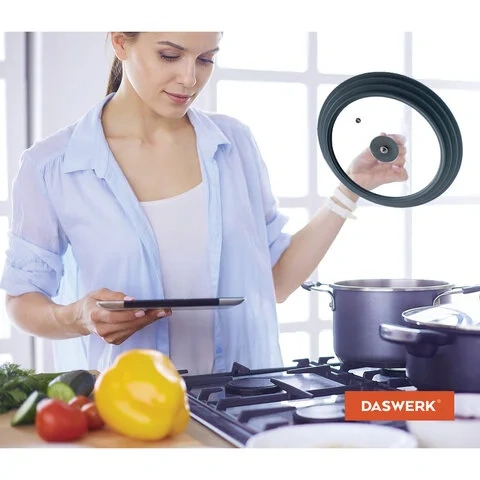 Больше не нужно хранить гору стеклянных крышек разного размера, универсальная крышка DASWERK существенно сэкономит место на кухне.