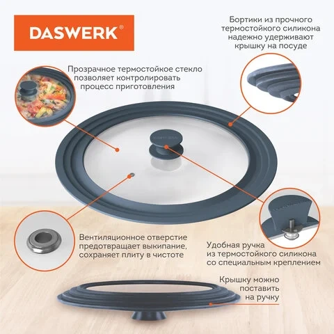 Крышка DASWERK изготовлена из термостойкого стекла, что позволяет контролировать процесс приготовления без потери тепла. Ободок из экологичного жаропрочного силикона выдерживает температуру до 220 °С.