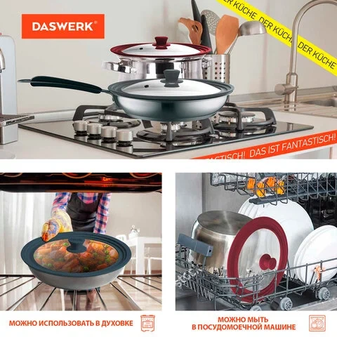 Крышка DASWERK изготовлена из термостойкого стекла, что позволяет контролировать процесс приготовления без потери тепла. Ободок из экологичного жаропрочного силикона выдерживает температуру до 220 °С.