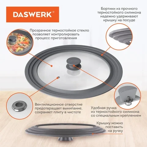 Крышка DASWERK изготовлена из термостойкого стекла, что позволяет контролировать процесс приготовления без потери тепла. Ободок из экологичного жаропрочного силикона выдерживает температуру до 220 °С.