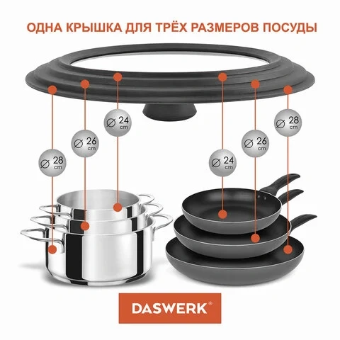 Больше не нужно хранить гору стеклянных крышек разного размера, универсальная крышка DASWERK существенно сэкономит место на кухне.