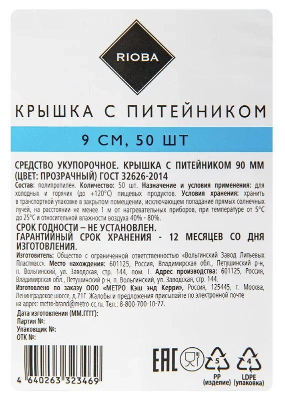 Крышка имеет диаметр 90 мм, что позволяет использовать ее со стаканами с соответствующим диаметром горловины.