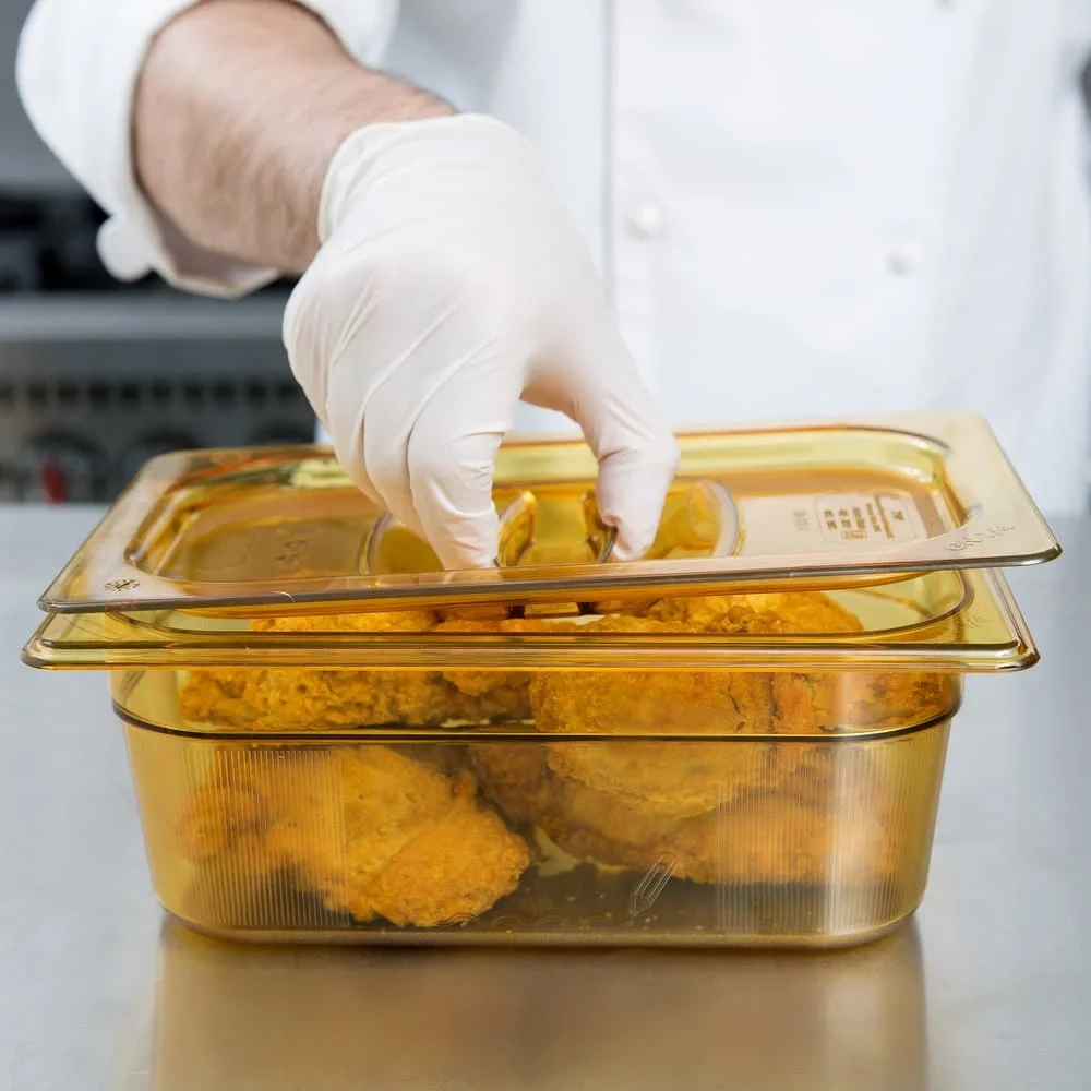 Износоустойчивые крышки для гастроемкостей Gastronorm® для горячих блюд. Изготовлен из полиэфиримида (PEI) (Ultem) – это аморфный термопластический материал, характеризующийся высокой прочностью и термостойкостью. Его способность сохранять свои свойства при температурах до 190 °C, низкий коэффициент теплового расширения, химическая стойкость, его негорючесть и отсутствие токсичности и выделения дыма при воздействии открытым огнем делают его идеальным материалом для изделий, от которых требуется высокая прочность при высоком нагреве, имеет высокую прозрачность.