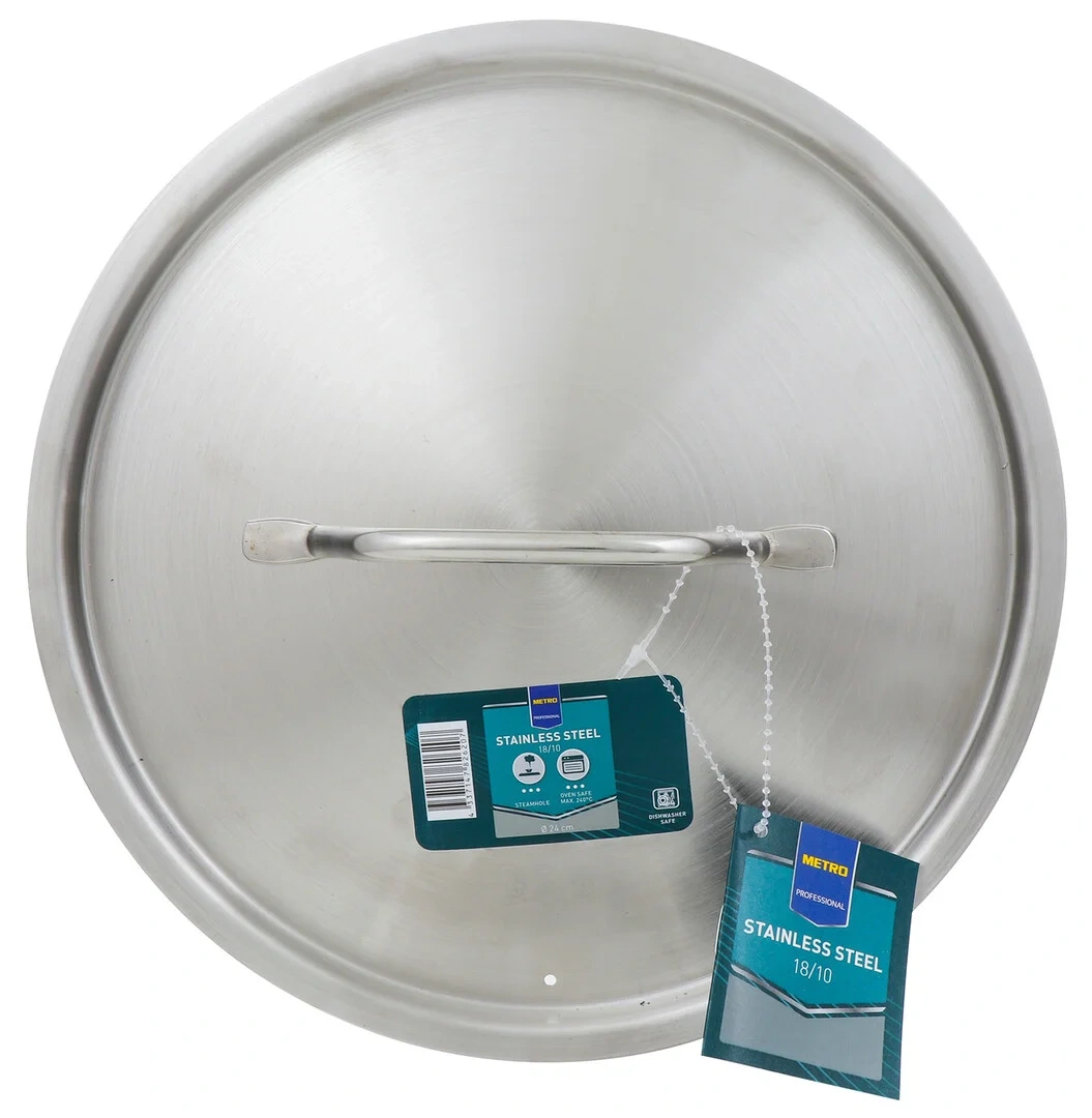 METRO PROFESSIONAL Крышка нержавеющая сталь, 24 см идеально подходит для кастрюль и сковородок соответствующего диаметра. У нее усиленные бортики, которые обеспечивают плотное прилегание, что обеспечивает более быстрое приготовление блюд. Такое изделие можно использовать на профессиональных кухнях в барах, ресторанах и других заведениях общественного питания или в домашних условиях. Стальная крышка рассчитана на длительное использование. У нее матовая поверхность с зеркальной полировкой и антипригарное покрытие. Чтобы сохранить изначальный внешний вид рекомендуется мыть изделие с помощью мягких губок под проточной водой (холодной или горячей). Использование агрессивных или абразивных моющих средств может повредить покрытие. Крышка не подвержена влиянию высоких температур и не подвержена коррозии. Материал, из которого изготовлено изделие, прочный, долговечный. Он не деформируется при нагревании, не впитывает запахи и не выделяет опасных или токсичных веществ. Сталь считается одним из лучших материалов для изготовления кухонной посуды.