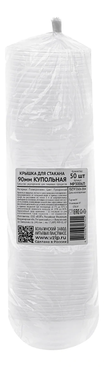 Крышка для стакана одноразовая Vzlp купольная пластиковая прозрачная 9см, 50шт