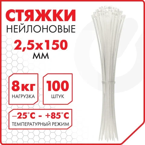 Стяжка (хомут) нейлоновая сверхпрочная POWER LOCK, 2,5х150 мм, КОМПЛЕКТ 100 шт., белая, SONNEN, 6079