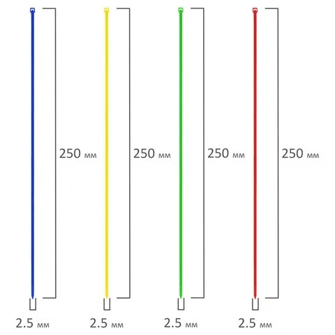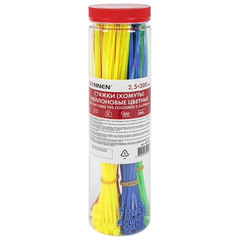 Стяжки (хомуты) нейлоновые сверхпрочные ЦВЕТНЫЕ в тубе 2,5х200 мм, КОМПЛЕКТ 200 шт., SONNEN, 607925