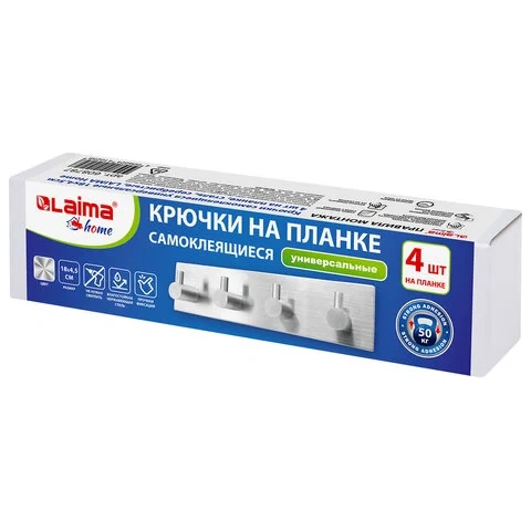 Крючки самоклеящиеся универсальные 18х4,5 см, 4 шт. на планке, сталь, серебристые, LAIMA Home, 60878