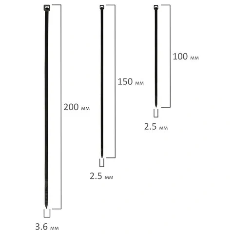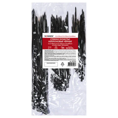 Стяжки (хомуты) нейлоновые сверхпрочные НАБОР 150 шт. (2,5х100/150 мм; 3,6х200 мм), черные, SONNEN,