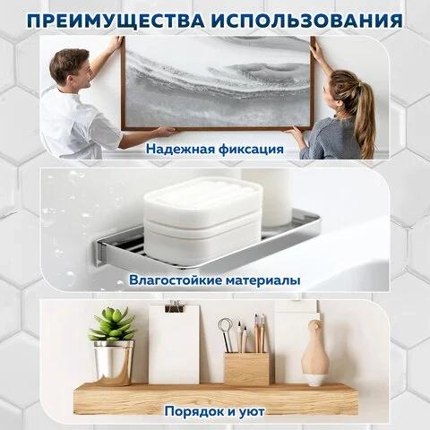 Их можно использовать для размещения картин, рамок, сетевых фильтров, Wi-Fi роутеров, органайзеров, небольших полок, а также принадлежностей для ванной и туалета. Изготовлены из прозрачного ABS-пластика, поэтому не вызовут визуальный дискомфорт и великолепно впишутся в любой интерьер.