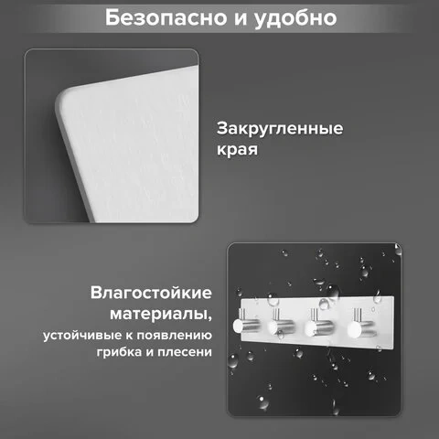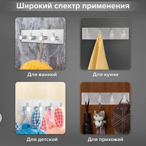 Крючки в количестве 4-х штук на общей планке, размер основания - 18 x 4,5 см. Цвет - серебристый. Выдерживают вес до 50 кг.