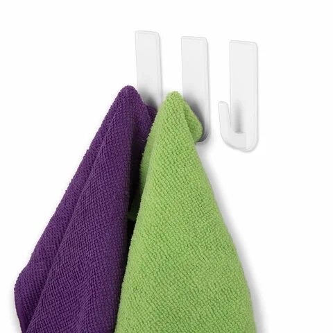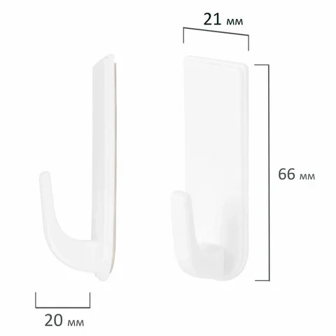 Крючки изготовлены из белого пластика. Благодаря клеевой основе из вспененного полиэтилена подходят для крепления на любые гладкие поверхности, позволяют обойтись без сверления стен.