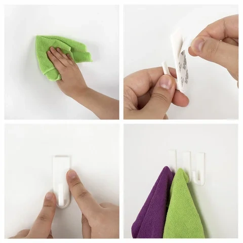 Для крепления крючка просто следуйте инструкции, приведенной на упаковке: 1) тщательно обезжирьте и высушите поверхность, на которой предполагается использовать крючок; 2) прогрейте клеевую поверхность крючка бытовым феном; 3) снимите защитный слой с клеевой поверхности крючка; 4) крепко прижимайте крючок к стене в течение 60 секунд; 5) используйте крючок через 24 часа после приклеивания.