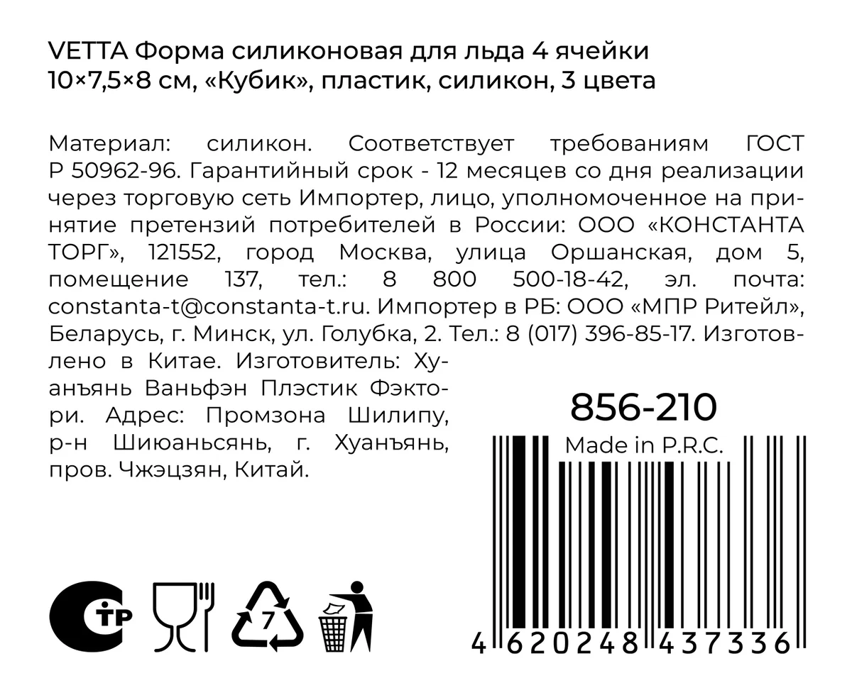 Форма для льда Vetta Кубик силиконовая 4 ячейки, 10.5 x 7.5 x 8см