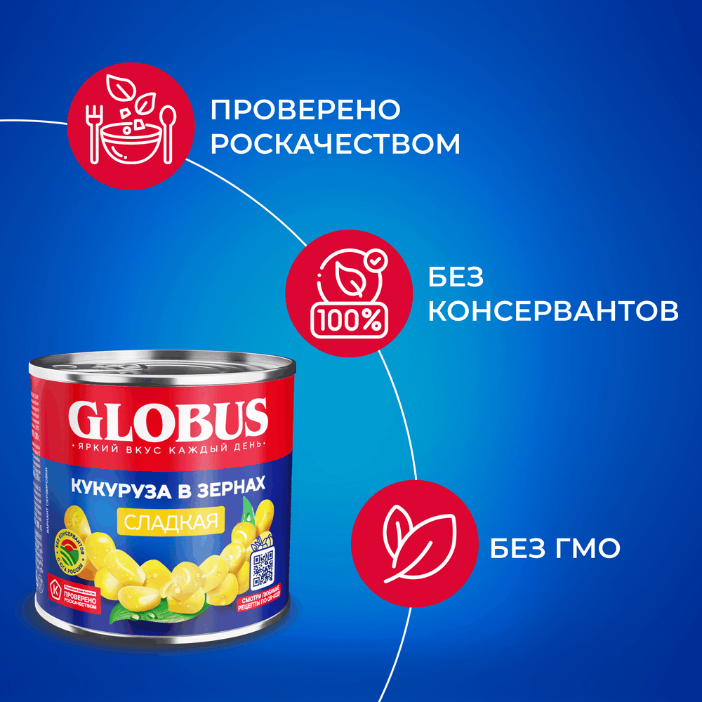 Неотъемлемый ингредиент десятков классических салатов, гарниров и даже десертов. Самое известное из праздничных блюд времен СССР, в рецептах которых занимает почетное место кукуруза Globus - легендарный крабовый салат. Сейчас повседневные и праздничные меню сильно изменились. Появились новые рецепты, выбор продуктов стал значительно богаче. Но кукуруза Globus все так же радует ценителей домашней кухни. И, как и раньше, этот продукт - признанный образец высочайшего качества. Неповторимый вкус кукурузы, выращенной на полях солнечной Кубани и собранной на пике зрелости, полностью сохраняется при обработке - продукт недаром отмечен наградами Российской Системы Качества. Кукуруза изготавливается на производстве, сертифицированном по международным стандартам ISO 9001 и ISO 22000. В ее составе нет консервантов, усилителей вкуса и прочих искусственных добавок.