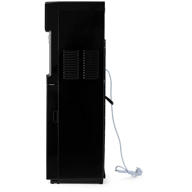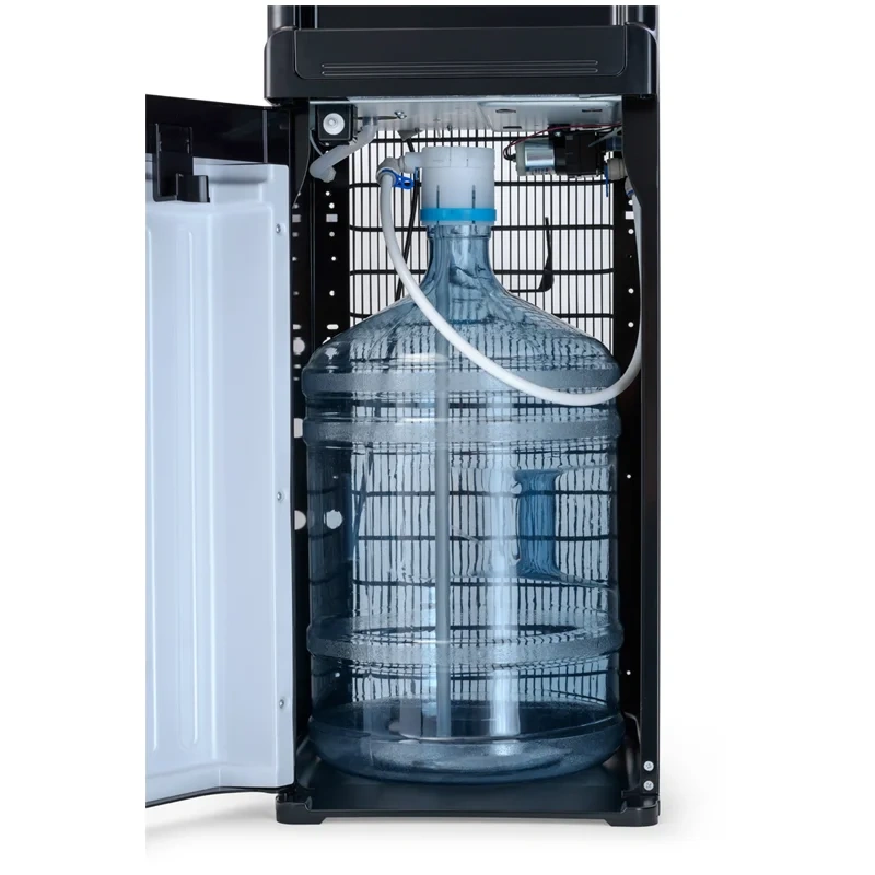 Кулер с электронным охлаждением черного цвета с металлической вставкой. Нижняя загрузка удобна для установки и замены бутыли. Модель оснащена тремя краниками-клавишами (горячая/прохладная/холодная). Клавиша горячей воды с защитой от случайного нажатия.