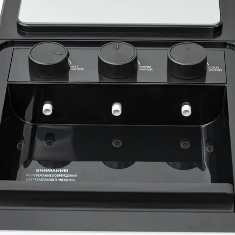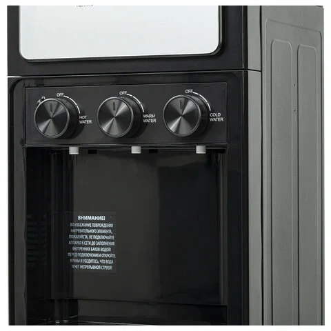 Он прост в использовании, имеет три поворотных крана для подачи горячей, холодной, а также воды комнатной температуры. Вода нагревается с помощью ТЭНа мощностью 500 Вт, что позволяет достичь температуры 90 °С за считанные минуты. Модуль электронного охлаждения мощностью 70 Вт обеспечивает поддержание температуры холодной воды на уровне 15 °С. Также изделие оборудовано функцией 'Защита от детей' на кране подачи горячей воды. Кулер оснащен LED-индикаторами на стеклянной панели, которые оповещают о нагреве, охлаждении и работе устройства.