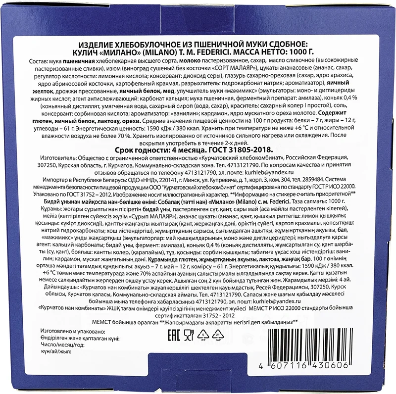 Кулич Federici Milano Panettone с цукатами и изюмом, 1кг
