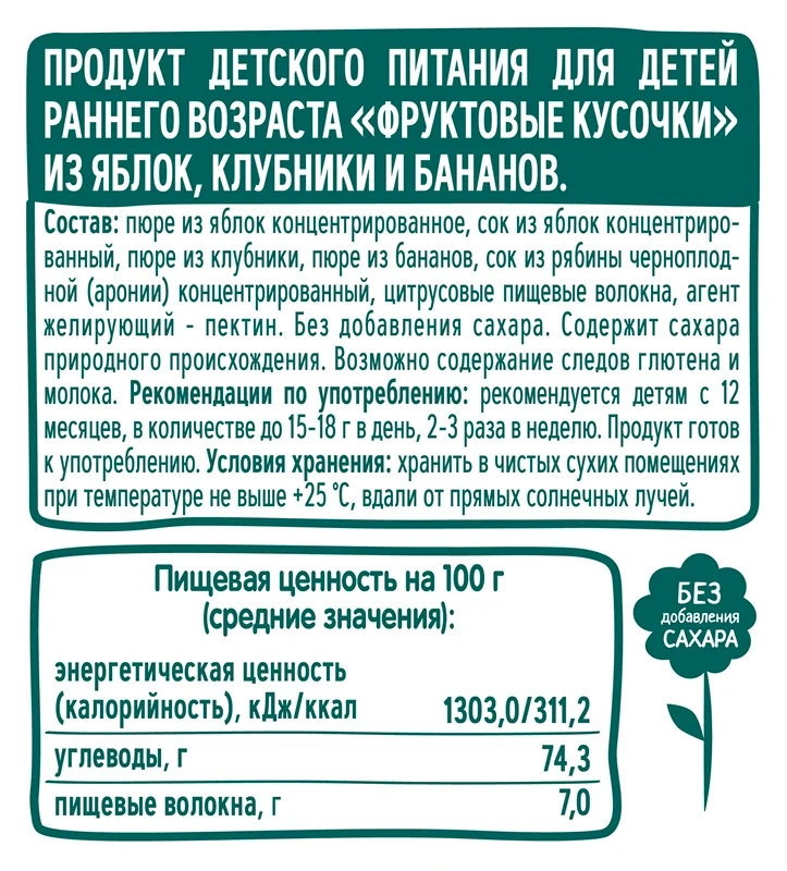 Фруктовые кусочки ФрутоНяня в аккуратном контейнере объемом 15 г – это смесь натуральных фруктов, предназначенная для питания детей или взрослых, неравнодушных к дарам природы. В составе продукта присутствуют только полезные и натуральные вещества, нет сахаров, консервантов, красителей и ароматизаторов. За счет уникальной технологии приготовления в каждом фруктовом кусочке сохраняются все витамины, микро- и макроэлементы, полезные для здоровья человека. Продукт готов к употреблению, рекомендован детям, начиная с 1 года. Давать питание можно 2-3 раза в сутки.