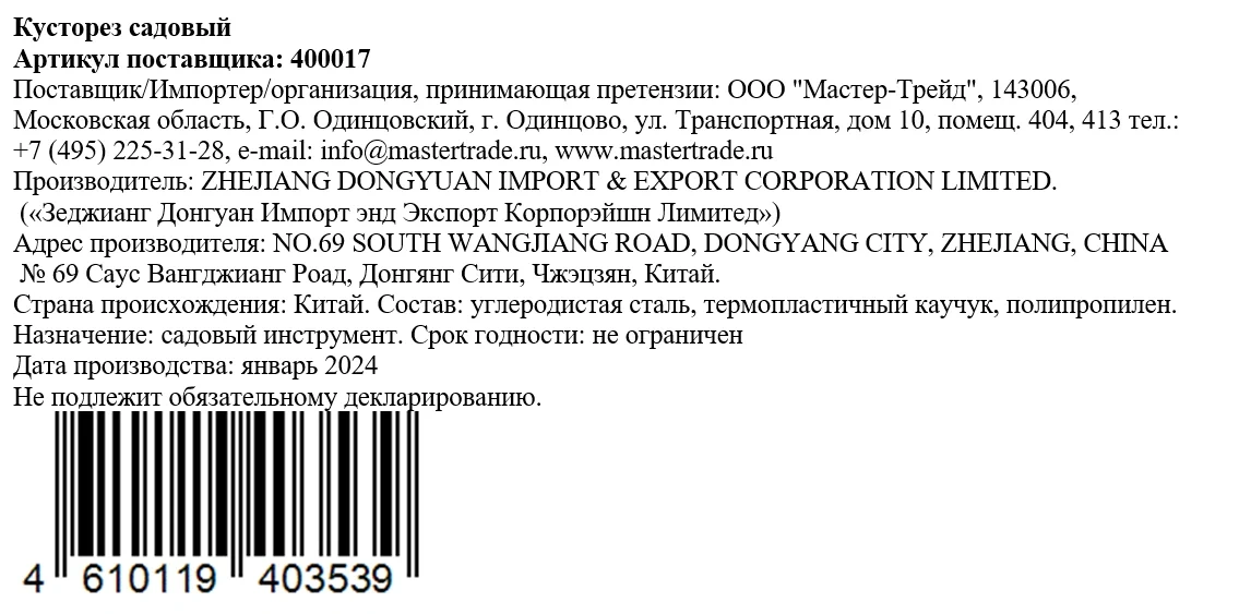 | Комплектация | кусторез - 1 шт. |