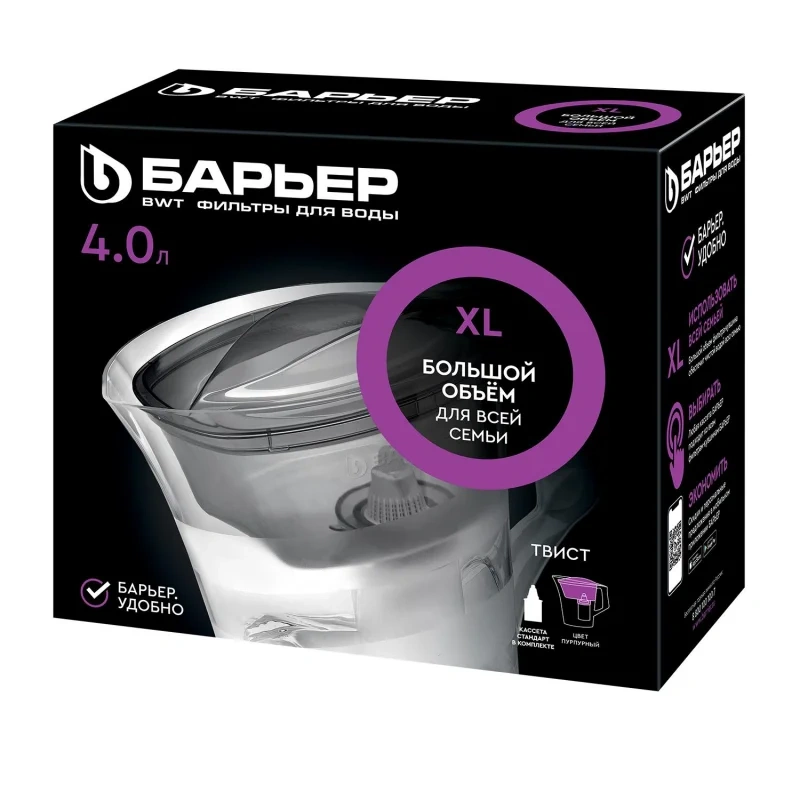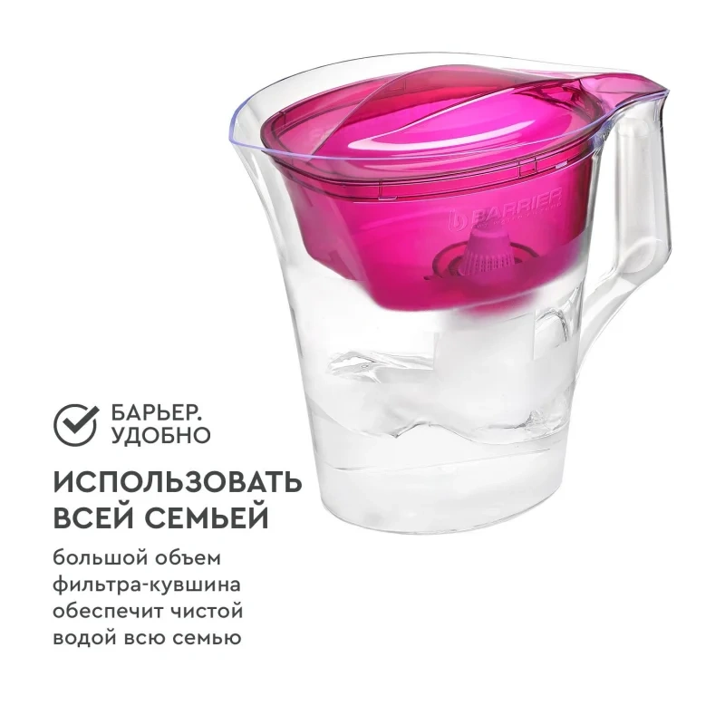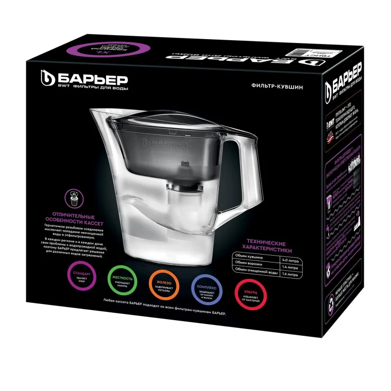 В комплекте с кувшином кассета Барьер Стандарт, которая защитит от хлора, тяжелых металлов и других вредных примесей. Резьбовое крепление кассеты исключает попадание неотфильтрованной воды в очищенную.