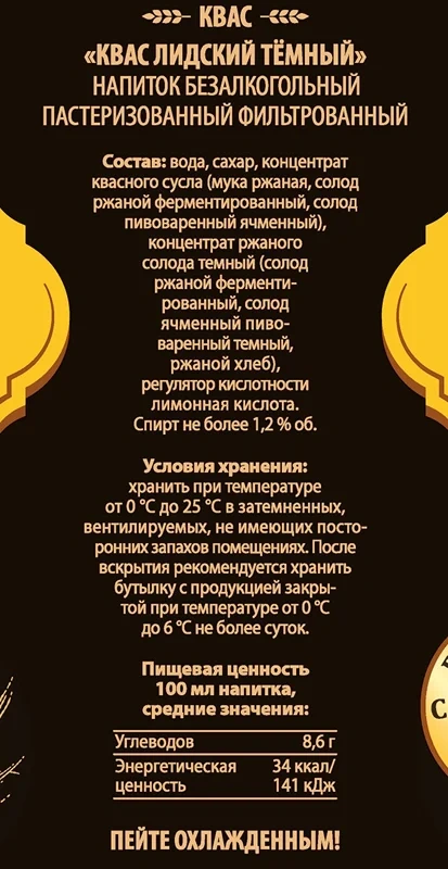 Натуральный квас брожения с экстрактом ржаного темного солода, который используют при выпечке черного хлеба. Этот компонент придает квасу кремовый вкус, насыщенный цвет и аромат поджаристой хлебной корочки.