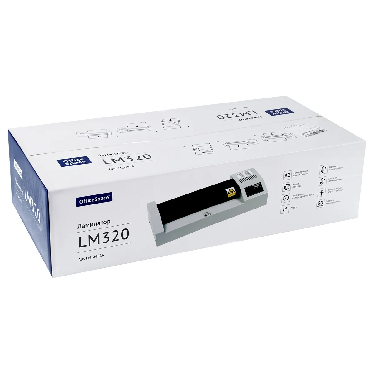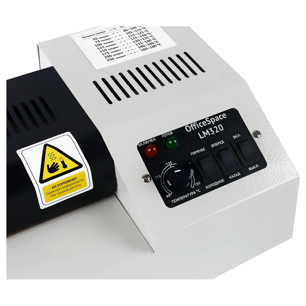 Ламинатор OfficeSpace LM320 предназначен для ламинирования бумаги, фотографий, документов, грамот, пропусков для защиты от влаги, пыли и прочих внешних воздействий. Скорость ламинирования – 50 см в минуту. Максимальный формат документа – А3. Толщина пленки от 50 до 250 мкм. Металлический корпус и возможность регулировки температуры. Время нагрева – 3-5 минут. Ширина входного отверстия – 330 мм.
