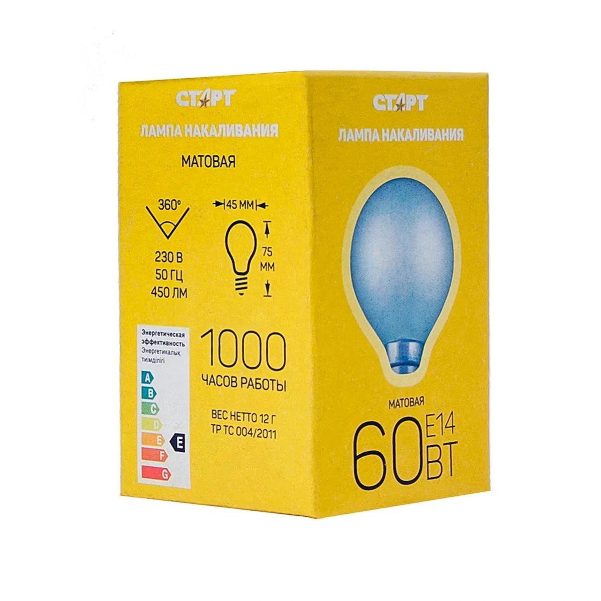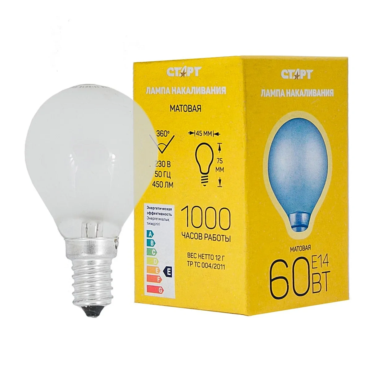 Лампа накаливания Старт E14 60W 230V шар ДШ матовая оснащена стандартным цоколем, что позволяет использовать её в самых разнообразных осветительных приборах. Лампа рассеивает ровный белый свет, не напрягающий зрение Мощность лампы 60 Вт позволяет экономить на электроэнергии за счёт достаточно низкого её потребления. Стоимость одной единицы продукции незначительна, ни один другой источник света не может сравниться по этому параметру с лампой накаливания. Объясняется это простотой производства, давно отлаженной автоматизированной технологией и отсутствием дорогих компонентов. При изготовлении ламп накаливания не используются токсичные материалы, изделие абсолютно безопасно как во время эксплуатации, так и после её завершения и даже в случае повреждения целостности колбы. Скачки напряжения – тоже не проблема для ламп этой категории. Источник света не разлетится на осколки, таким образом Вы избежите случайных ранений.