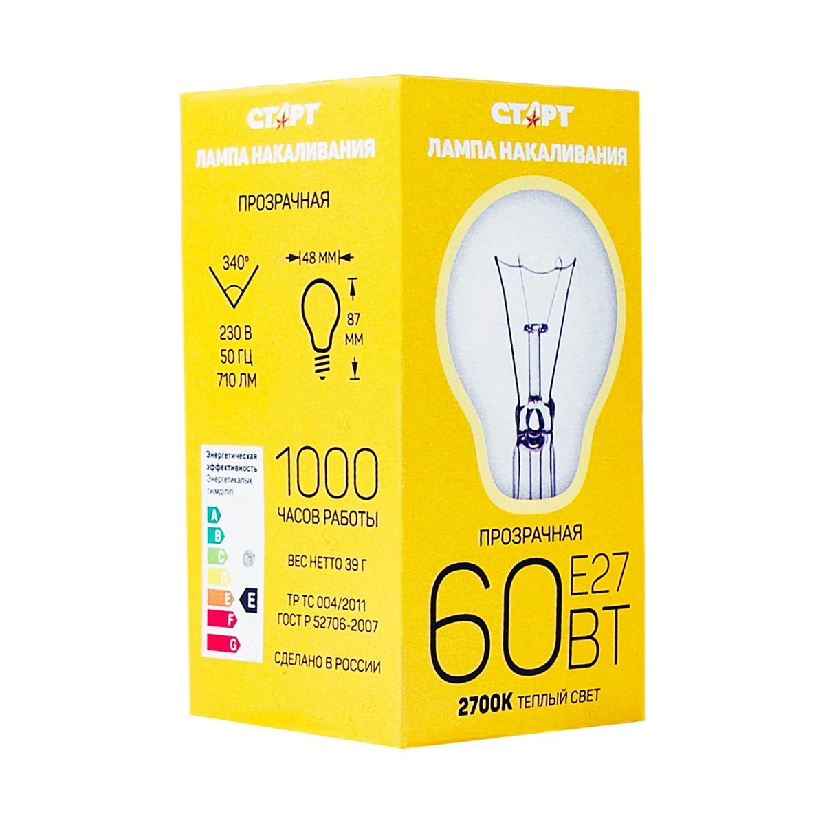 Лампа накаливания Старт E27 60W 220-240V груша Б прозрачная доступно и качественно Лампа накаливания Старт Б 60Вт Е27 - это отличный выбор для большинства торшеров, люстр. Она дает мягкое, приятное глазу освещение. Российская продукция Старт отличается надежностью и высоким качеством изготовления. Несмотря на большой ассортимент осветительной продукции на рынке, лампы Старт занимают одно из лидирующих позиций. Это объясняется тем, что продукция Старт имеет высокие технологические показатели в сравнении с низкой стоимостью. Благодаря такой экономичности, можно спокойно обеспечить дом освещением на длительный период. Главным преимуществом выступает выгодная цена. Современные технологии, качественные материалы – все это значительно увеличивает срок эксплуатации лампы. В результате осветительные приборы данной серии способны работы до 1000 часов. Кроме этого, лампы выдерживают перепады в сети, сохраняя свою работоспособность.