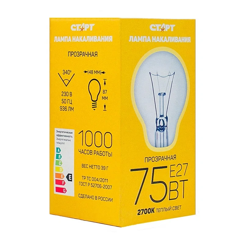 Лампа накаливания Старт E27 75W 220-240V груша Б прозрачная это один из лучших вариантов искусственного освещения. Прекрасно подойдет для таких источников как бра, торшеры, люстры. Недорогая и долговечная. Теперь не нужно переплачивать, чтобы получить ровное освещение дома. Благодаря доступной стоимости на осветительную продукцию Старт, можно спокойно купить набор ламп и обеспечить светом квартиру или дом на долгое время. Для создания прочной и долговечной продукции используются качественные материалы и современное оборудование. Благодаря этому, лампа Старт Б 75Вт Е27 прослужит долгое время и будет радовать мягким светом более 1000 часов. Лампы накаливания изготовлены из стекла, внутри которого заключена нетоксическая вольфрамовая нить. В результате этого, при нагревании осветительный элемент не выделяет опасных веществ.