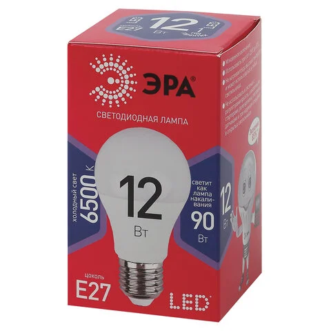 Лампа светодиодная ЭРА, 12(90)Вт, цоколь Е27, груша, холодный белый, 25000 ч, LED A60-12W-6500-E27,