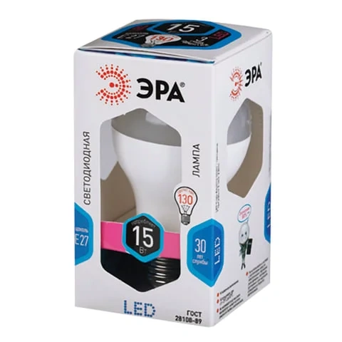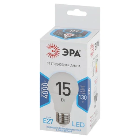 Лампа светодиодная Эра 15Вт, Е27, 4000К, нейтральный белый свет, груша