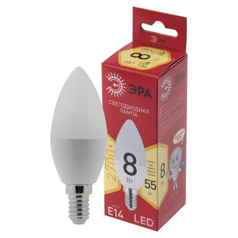 Лампа светодиодная ЭРА, 8(55)Вт, цоколь Е14, свеча, теплый белый, 25000 ч, LED B35-8W-2700-E14, Б005