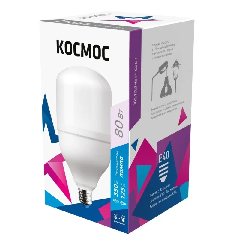 Лампа светодиодная КОСМОС HWLED 80W 220V E27 6500K, переходник на Е40
