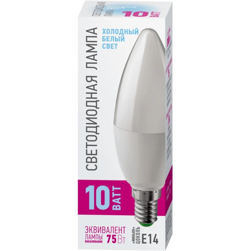 Светодиодная лампа мощностью 10 Вт излучает холодный белый свет, что делает её подходящей для яркого и чёткого освещения в помещениях. Лампа оснащена цоколем E14 и типом колбы C. Световой поток составляет 750 Лм, а цветовая температура — 4000 К.