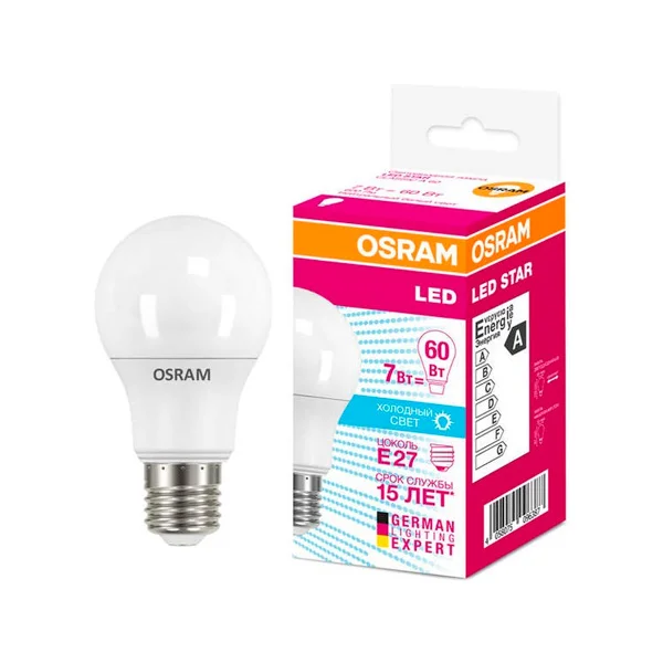 Лампа светодиодная OSRAM LED Star, 600лм, 7Вт (замена 60Вт), 4000К (нейтральный белый свет). Цоколь E27, колба A, угол пучка 180. Исполнение колбы матовое, пластик. Напряжение питания 170-250В. Стабильный световой поток 170-250В; работает с выключателем с подсветкой; гарантия 3 года. Товар сертифицирован.