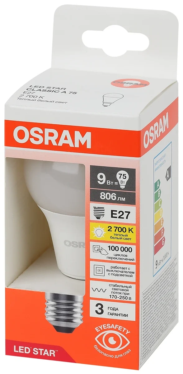 Лампа светодиодная OSRAM LED Star, 806лм, 9Вт (замена 75Вт), 2700К (теплый белый свет). Цоколь E27, колба A, угол пучка 180. Исполнение колбы матовое, пластик. Напряжение питания 170-250В. Стабильный световой поток 170-250В; работает с выключателем с подсветкой; гарантия 3 года. Товар сертифицирован.