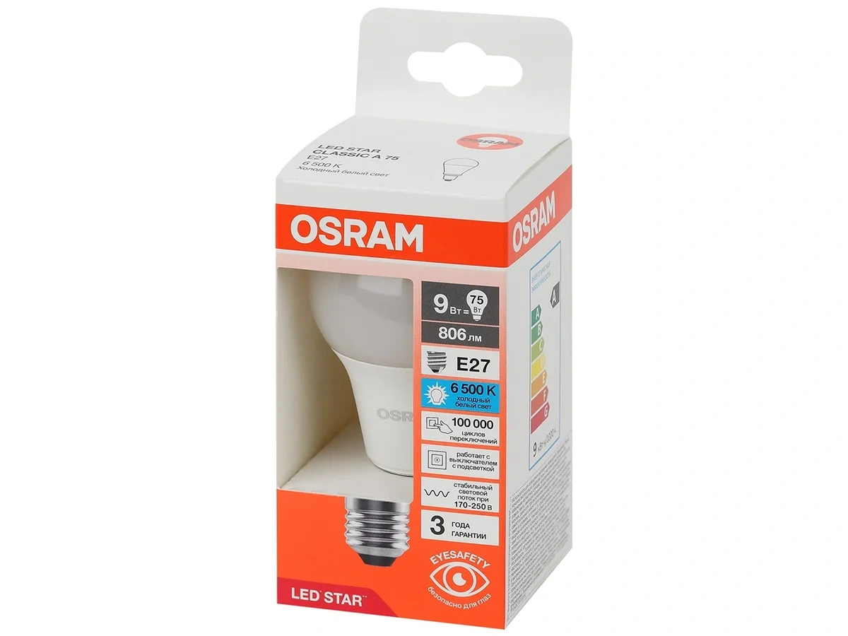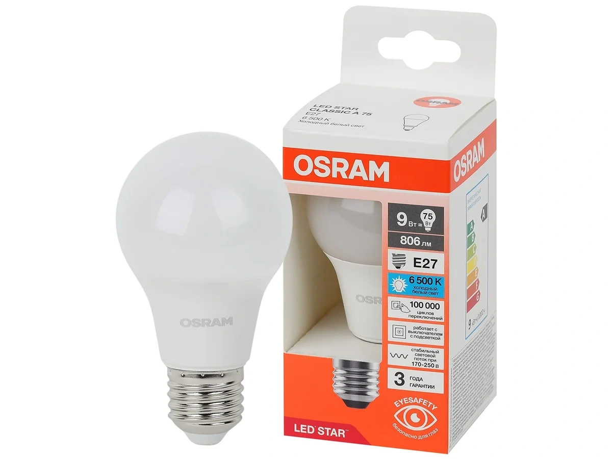 Лампа светодиодная OSRAM LED Star, 806лм, 9Вт (замена 75Вт), 6500К (холодный белый свет). Цоколь E27, колба A, угол пучка 180. Исполнение колбы матовое, пластик. Напряжение питания 170-250В. Стабильный световой поток 170-250В; работает с выключателем с подсветкой; гарантия 3 года. Товар сертифицирован.