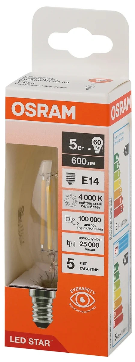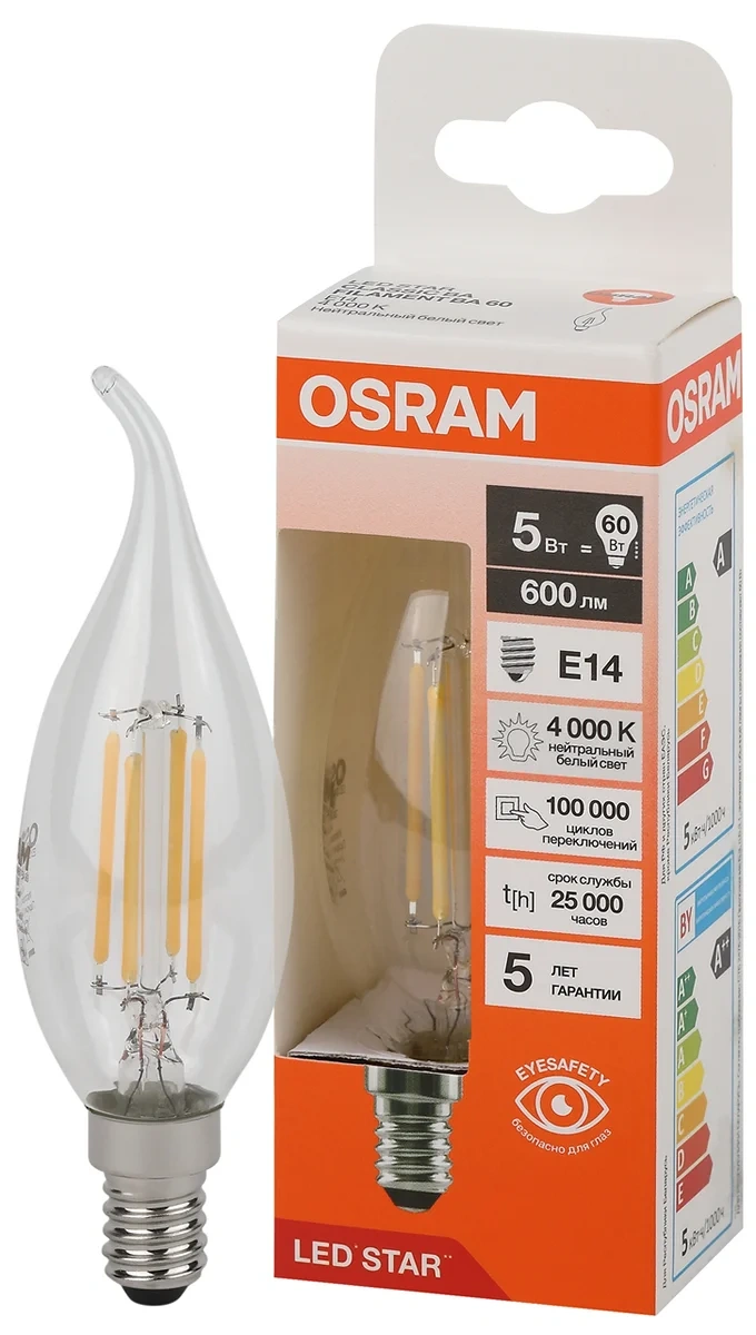 Лампа светодиодная филаментная OSRAM LED Star, 600лм, 5Вт (замена 60Вт), 4000К (нейтральный белый свет). Цоколь E14, колба BA, угол пучка 300. Исполнение колбы прозрачное, стекло. Напряжение питания 220-240В. Особенности: гарантия 5 лет. Товар сертифицирован.