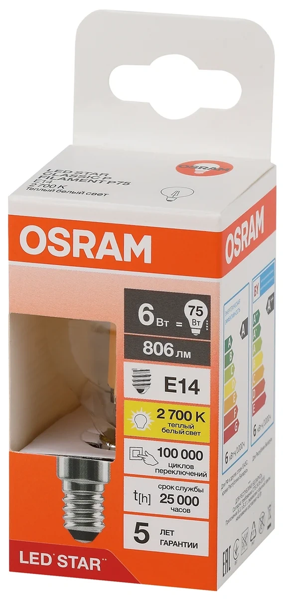 Лампа светодиодная филаментная OSRAM LED Star, 806лм, 6Вт (замена 75Вт), 2700К (теплый белый свет). Цоколь E14, колба P, угол пучка 300. Исполнение колбы прозрачное, стекло. Напряжение питания 220-240В. Особенности: гарантия 5 лет. Товар сертифицирован.