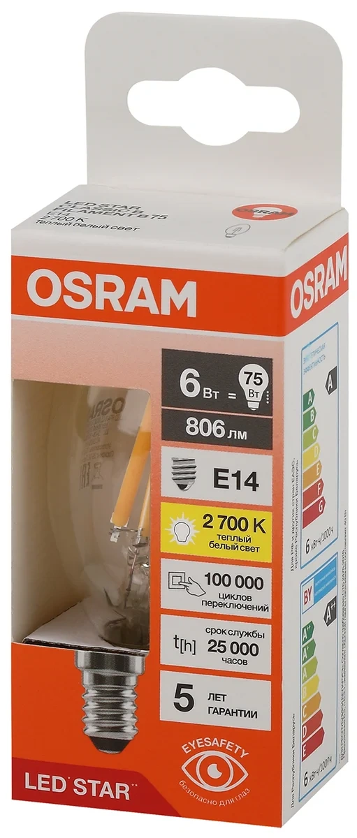 Лампа светодиодная филаментная OSRAM LED Star, 806лм, 6Вт (замена 75Вт), 2700К (теплый белый свет). Цоколь E14, колба B, угол пучка 300. Исполнение колбы прозрачное, стекло. Напряжение питания 220-240В. Особенности: гарантия 5 лет. Товар сертифицирован.