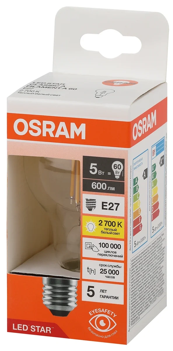 Лампа светодиодная филаментная OSRAM LED Star, 600лм, 5Вт (замена 60Вт), 2700К (теплый белый свет). Цоколь E27, колба A, угол пучка 300. Исполнение колбы прозрачное, стекло. Напряжение питания 220-240В. Особенности: гарантия 5 лет. Товар сертифицирован.