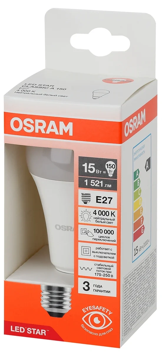 Лампа светодиодная OSRAM LED Star, 1521лм, 15Вт (замена 150Вт), 4000К (нейтральный белый свет). Цоколь E27, колба A, угол пучка 180. Исполнение колбы матовое, пластик. Напряжение питания 170-250В. Стабильный световой поток 170-250В; работает с выключателем с подсветкой; гарантия 3 года. Товар сертифицирован.