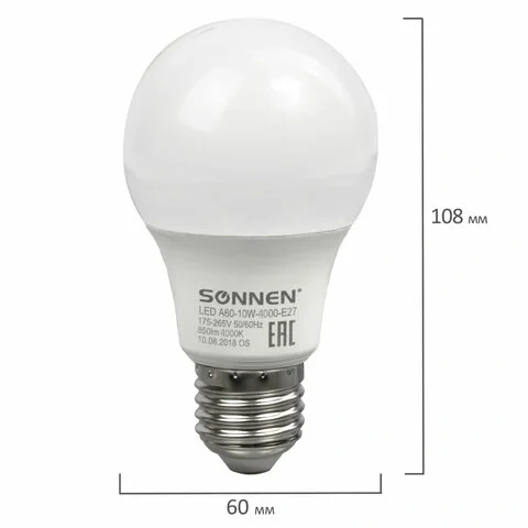 Лампа светодиодная Sonnen 10Вт, Е27, 4000К, холодный белый свет, груша